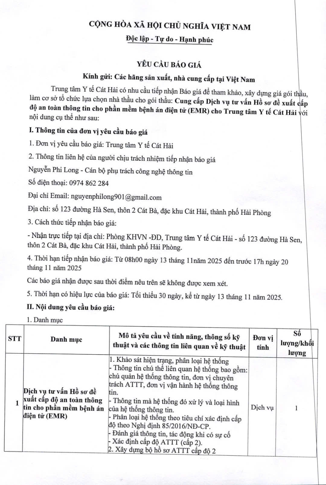 Về việc báo giá thuê dịch vụ triển khai hồ sơ bệnh án điện tử của Trung tâm Y tế Cát Hải