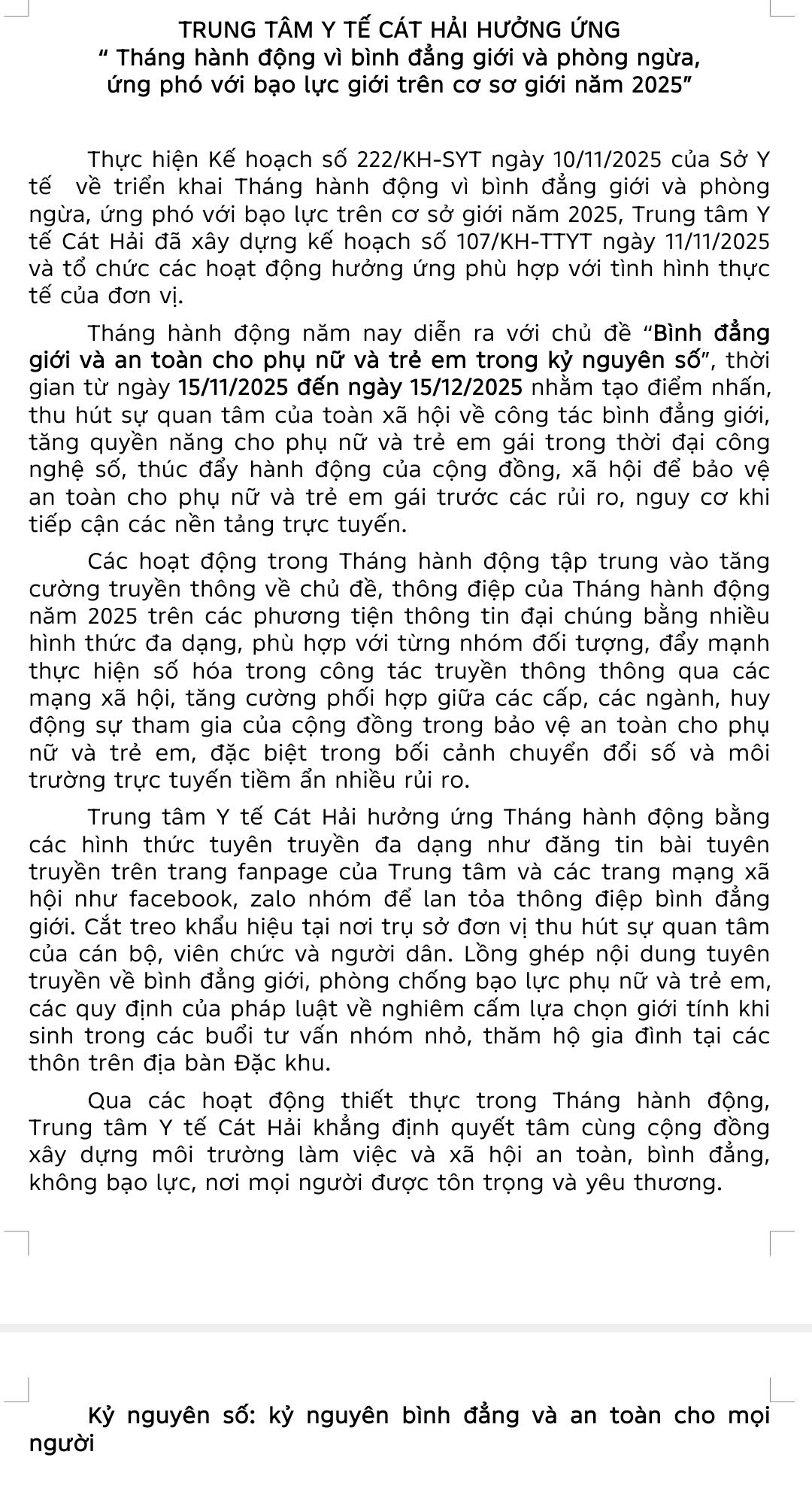 TRUNG TÂM Y TẾ CÁT HẢI HƯỞNG ỨNG “ Tháng hành động vì bình đẳng giới và phòng ngừa, ứng phó với...